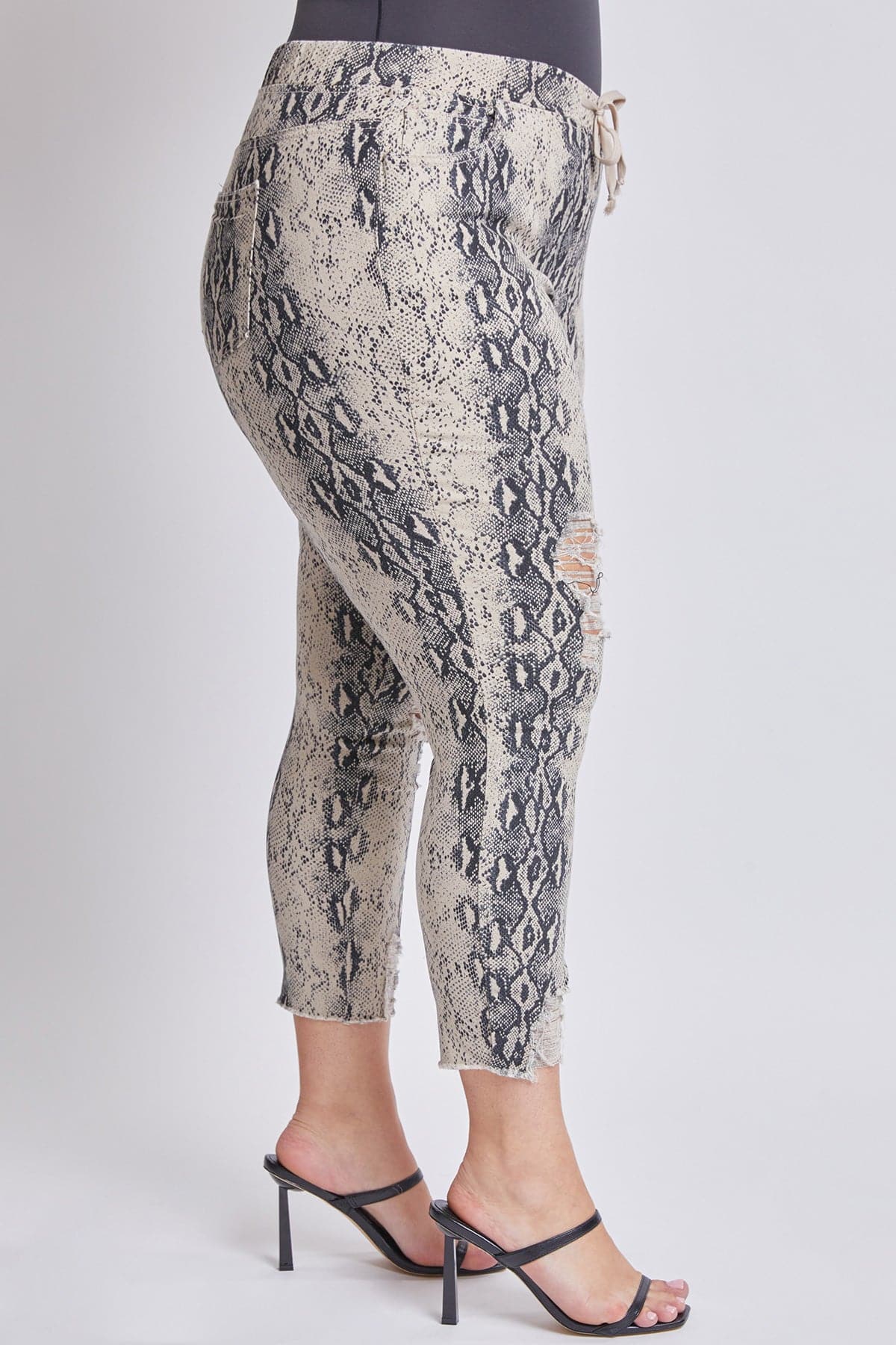 Get that look you’ve been dying to try. Accentuate your shape with our Women's Plus Size High-Rise Ankle Jogger! Now featuring elastic waistband for added enhancement, distressed detailing, drawstring on front, five-pocket construction and faux zipper flap.