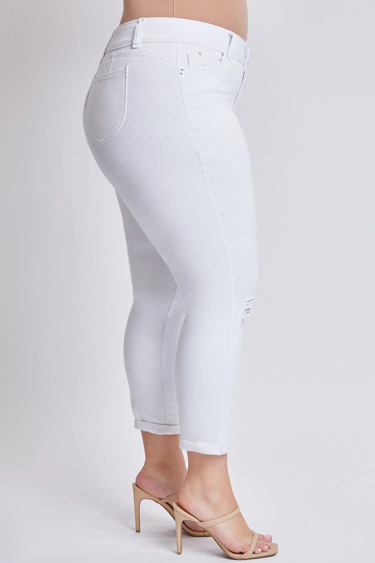 Take our Women's Plus Size WannaBettaButt Mid-Rise Cuffed Ankle Jeans out on the town! Featuring a cuffed hem, light whiskering and destruction on front, classic five-pocket construction, two-button closure with front zip, our iconic WBB fit for the perfect lift, and belt loops. Style with a fitted tank and heeled sandals for a timeless look!