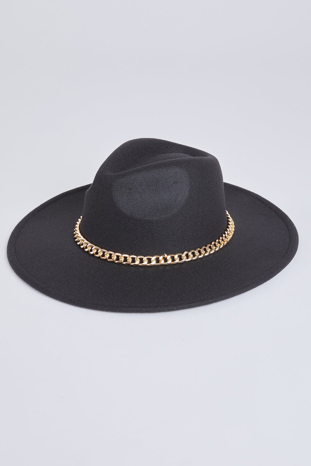 A timeless accessory to top off any look! Our Women’s Chain Wide Brim Hat is made with a soft felted wool material and a wide, structured brim. This hat has a high crown and teardrop top. Accentuated with a gold chain trim for a super chic look! This hat has an adjustable interior to fit you perfectly. Pair this hat with our jeans, a shacket, and booties for an effortless look!