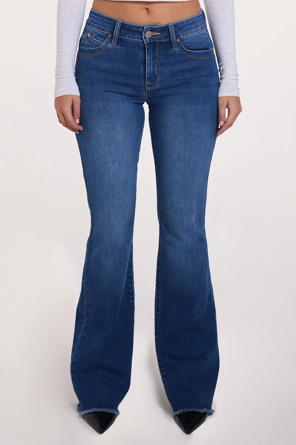 Take our Women's WannaBettaButt High-Rise Flare jean out on the town! These flared butt lifting jeans feature our signature WannaBettaButt heart-shaped stitching and uniquely made pockets for a natural butt-lift that you'll love. Detailed with a frayed and flared hem, light whiskering, and a distressed front.