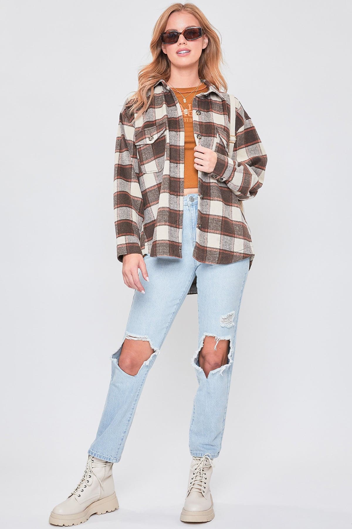 Your cool-weather look isn't complete without our Women's Plaid Shacket! Not only is this shacket trendy and cute, it’s also super soft and comfy! It’s the perfect layering piece to bring out your inner cool girl. Featuring two large front pockets and tortoise shell buttons to add some edge. This shacket is meant to be slightly oversized. Size up for an extra slouchy look. We love this shacket paired with a simple cropped tee or bodysuit, distressed jeans, and booties or combat boots.