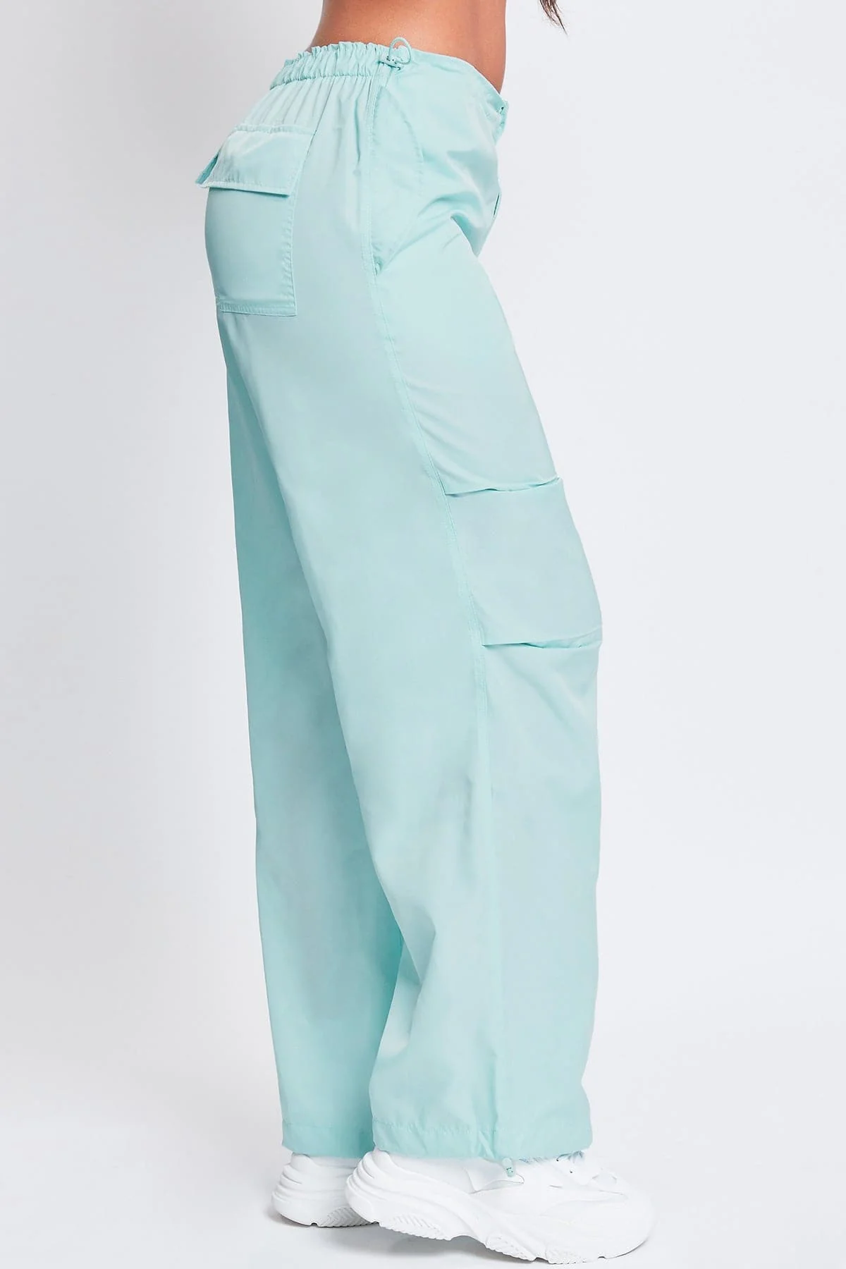 Getting dressed is a cinch with our Women’s Relaxed Fit Nylon Parachute Pants. These high-waisted nylon pants feature a relaxed, slouchy fit for a cool look and comfy feel. Features bungee ties at the waist and hem for optional cinching, a front zip fly with hidden button closure, and snap button flap pockets at the front and back. Detailed with subtle layered pleats on the front. Style this pant with a fitted top and sneakers for a sporty-chic vibe.